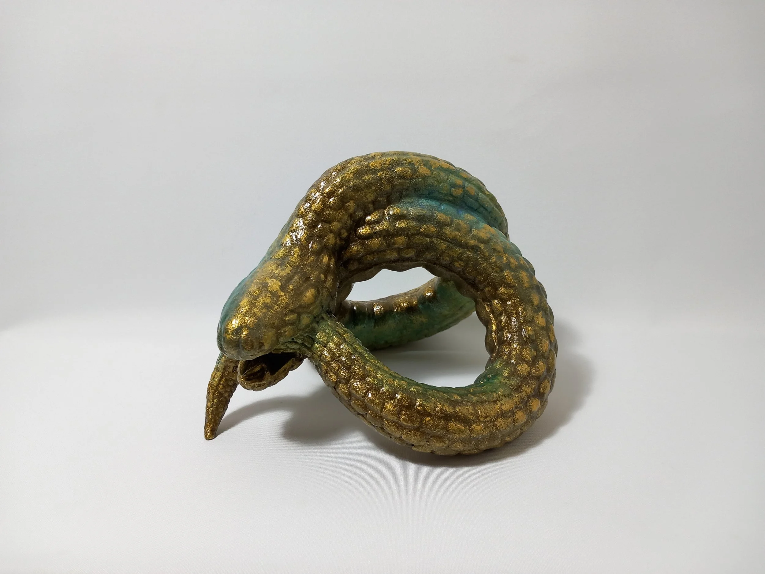 Ouroboros, A sculpture of a snake eating its own tail. Made out of clay, Textured in aged gold. Resting on its larger parts of its body, clutching the end of its tail. It represents an iconic form of symbolism.