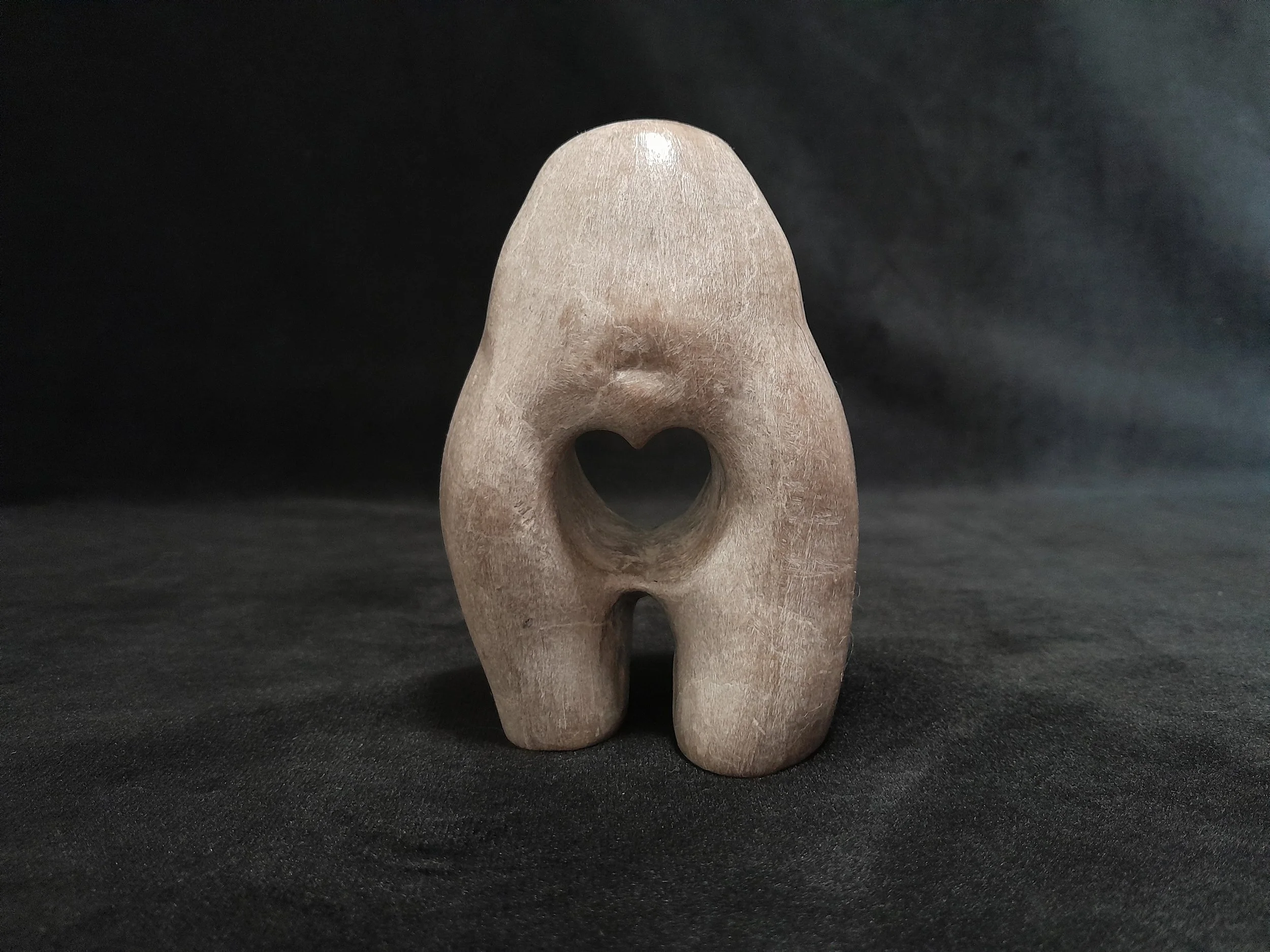 An abstract design on a figurative form. The sculpture frames a heart shaped symbol which is rounded seamlessly into the body of the figure.