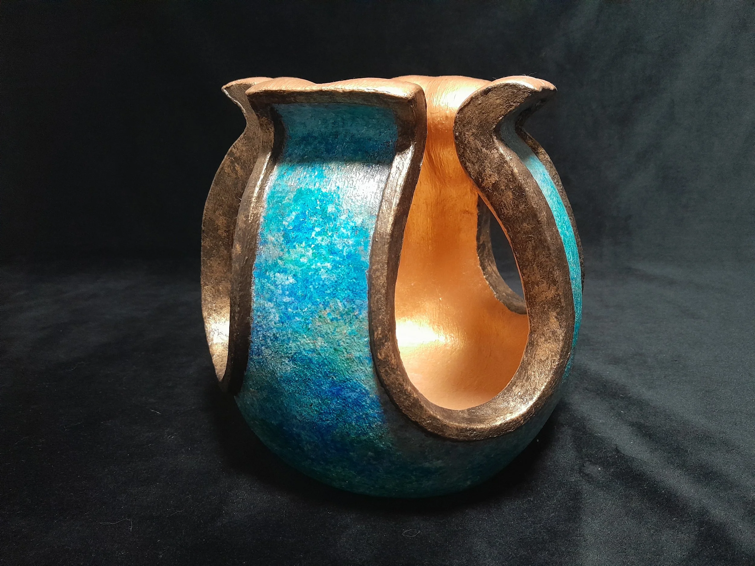 The Orb #2 Slide 1 Slide 1 (current slide) Slide 2 Slide 2 (current slide) Slide 3 Slide 3 (current slide) Slide 4 Slide 4 (current slide) Slide 5 Slide 5 (current slide) Slide 6 Slide 6 (current slide) Slide 7 Slide 7 (current slide) Slide 8 Slide 8 (current slide) Slide 9 Slide 9 (current slide) Slide 10 Slide 10 (current slide) Sculpture Title: The Orb #2 Created 14/08/24 Hand Crafted An abstract vase, Made out of Clay. Marbled in a blue cobalt finish encasing a golden core, Walls rising upwards into a curled edge. Inspired by the similar shaping to a tulip bud, encasing a golden nectar like glow. Dimensions. Width : 19.0cm Depth : 19.0cm Materials. Clay Weight. Height : 20.0cm 2.8kg